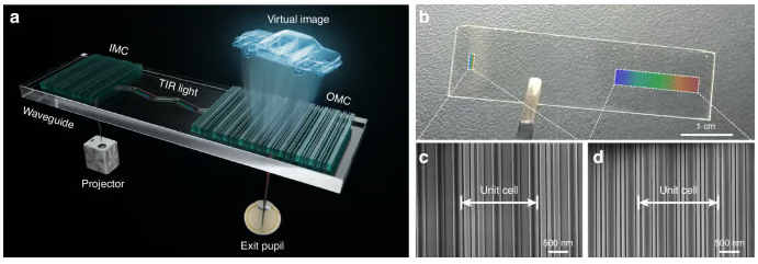 また、導波路を通過するたびに光が減衰するため、明るい屋外での視認性が低下する「光効率問題」も重要な課題です。2025年にNature Light: Science & Applicationsに掲載された研究では、ナノスケールのメタサーフェス構造を格子に用いることで、光効率を大幅に向上できると報告されており、解決に向けた研究が着実に進んでいます。
